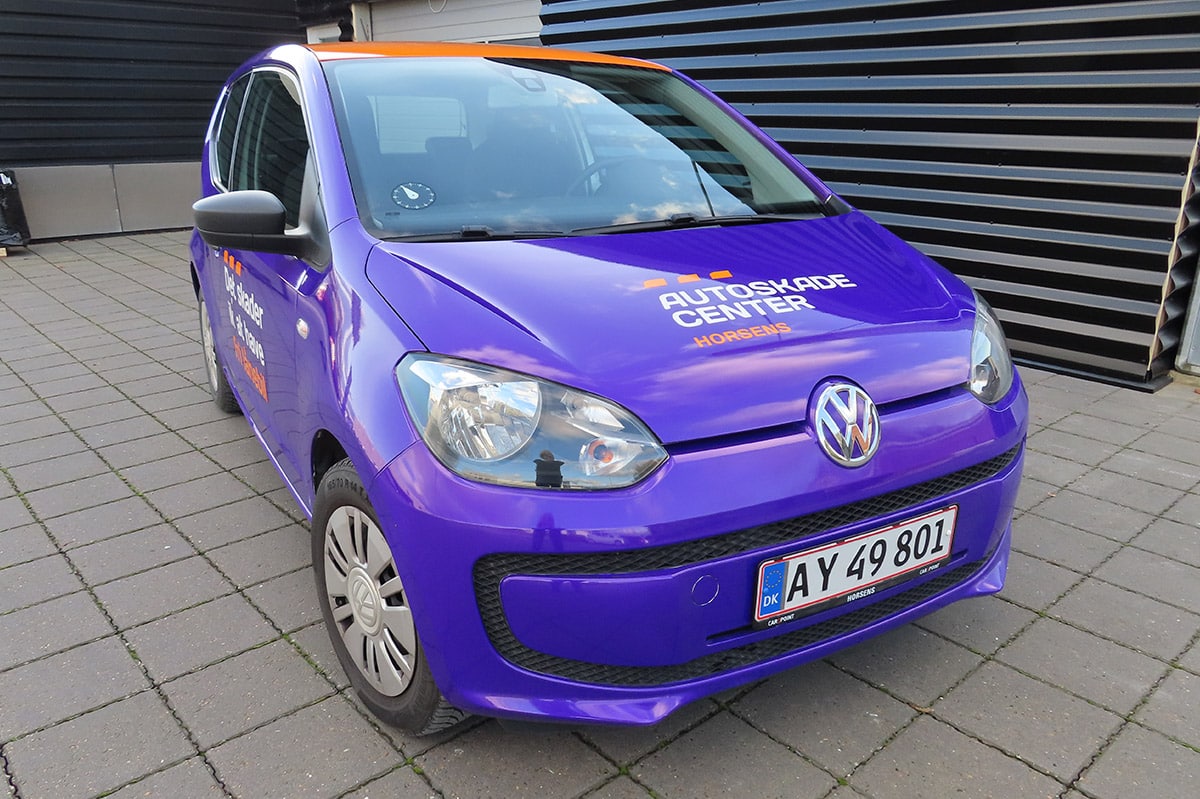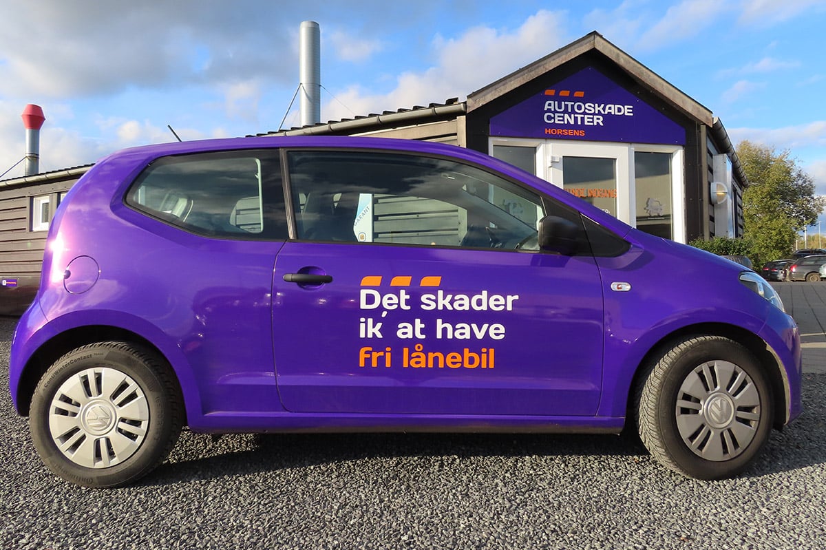 Vi bor i industrikvarteret på Vågøvej 8 i Horsens – du kan kende os på vores orange og lilla lånebiler og på det store lilla skilt ved vores bygninger. Vi har samlet pladeværksted og autolakering under samme tag – derfor har vi en høj effektivitet og din bil bliver i vores hænder under hele processen.